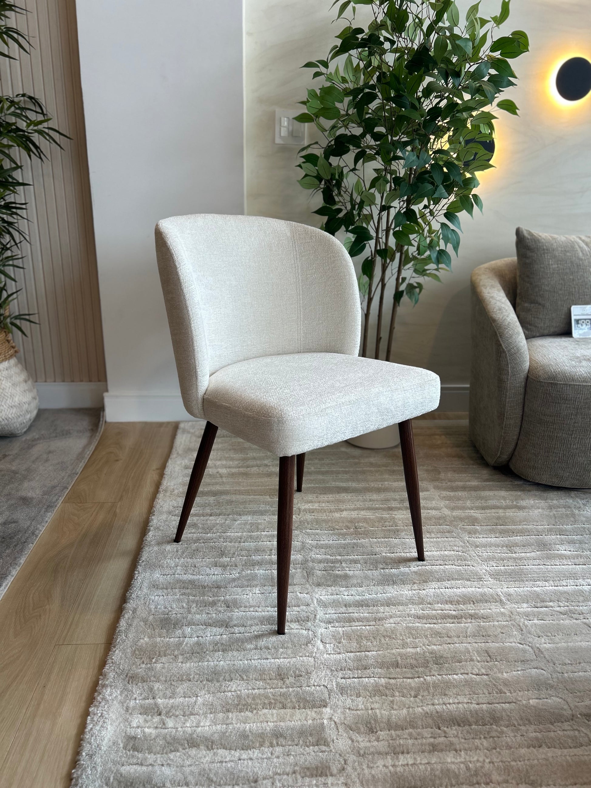 Silla de comedor tapizada en elegante tela color blanco hueso. Patas de acero color nuez oscuro.