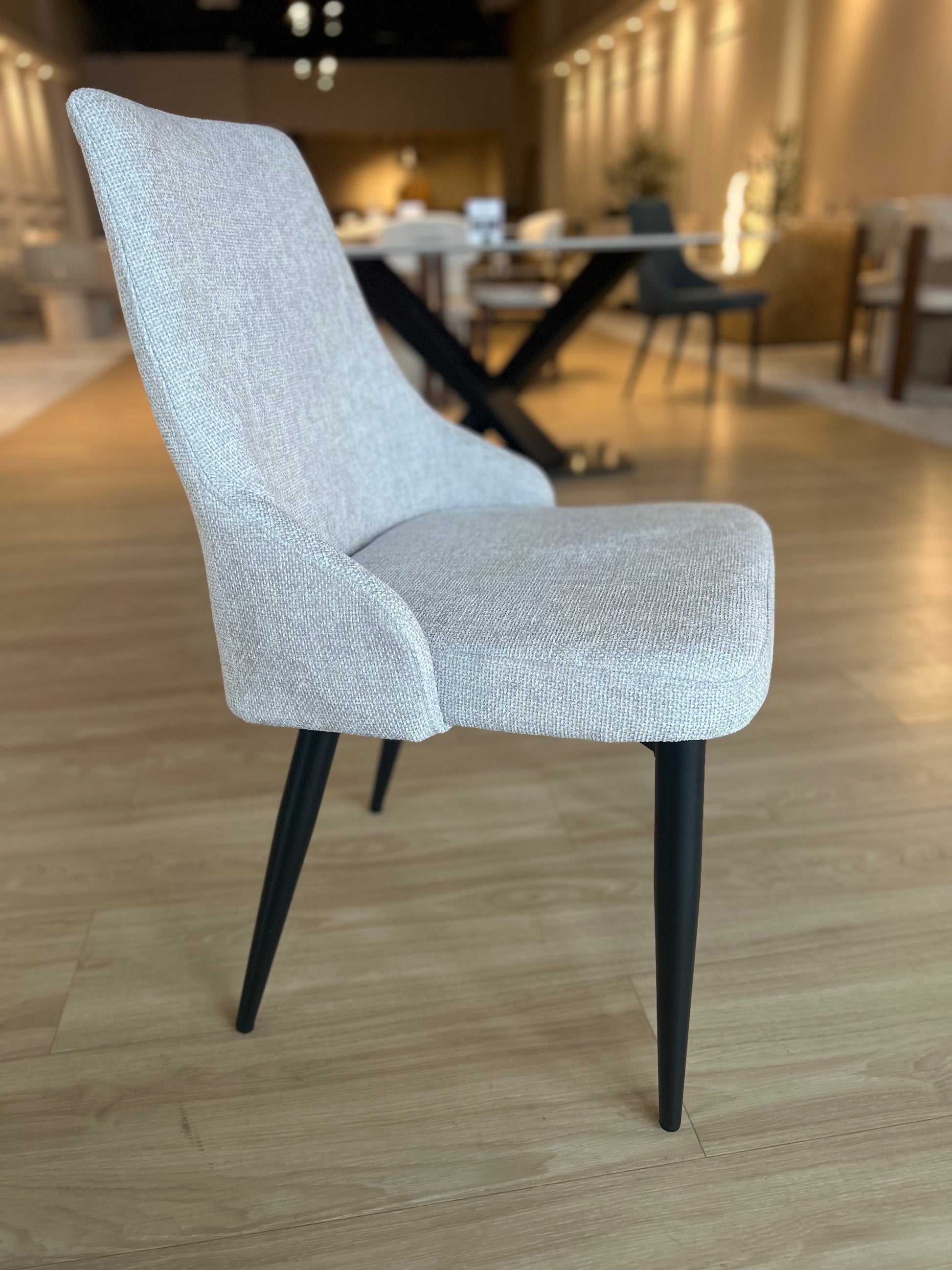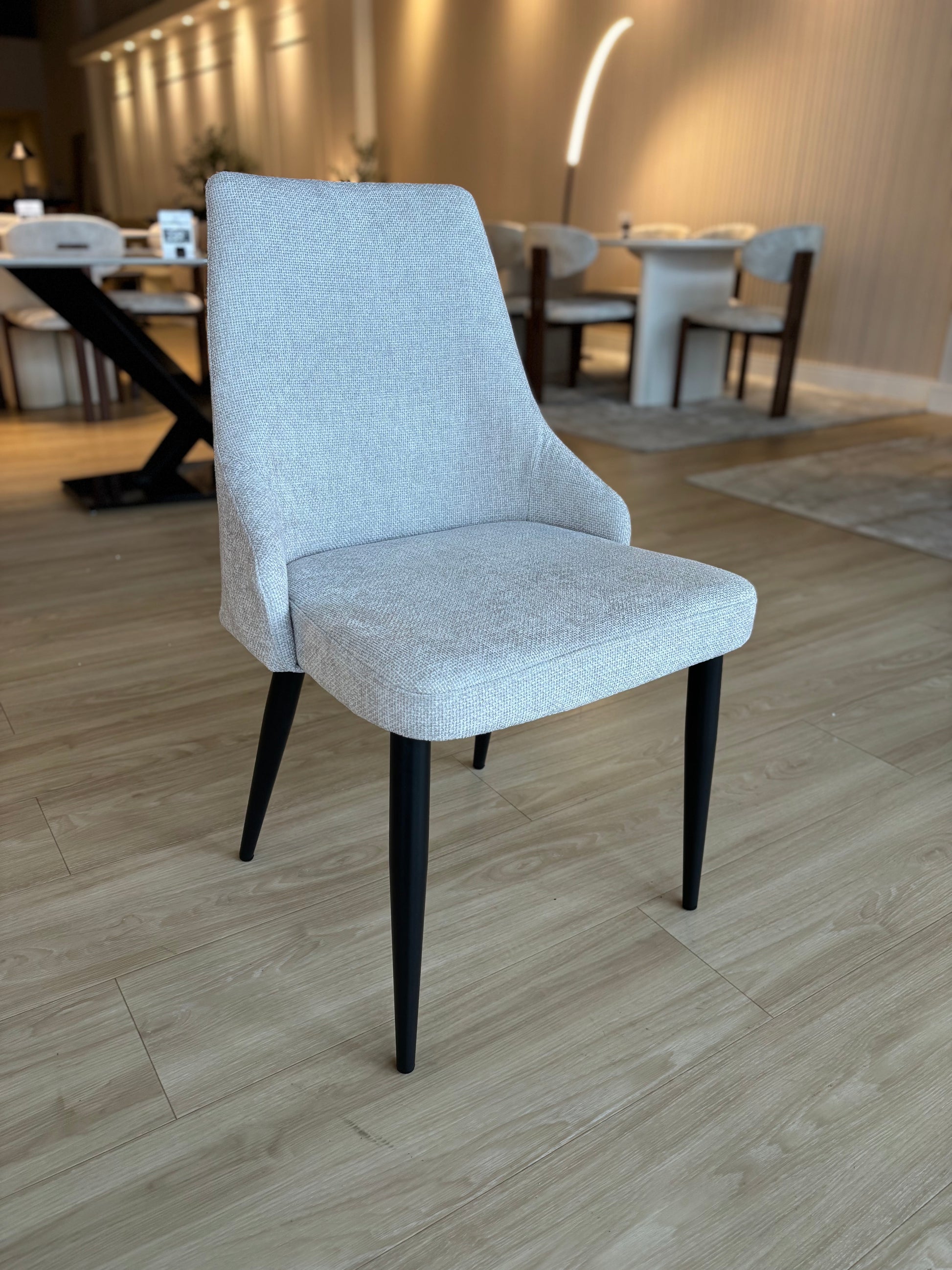 Silla de comedor tapizada en elegante tela gris claro.