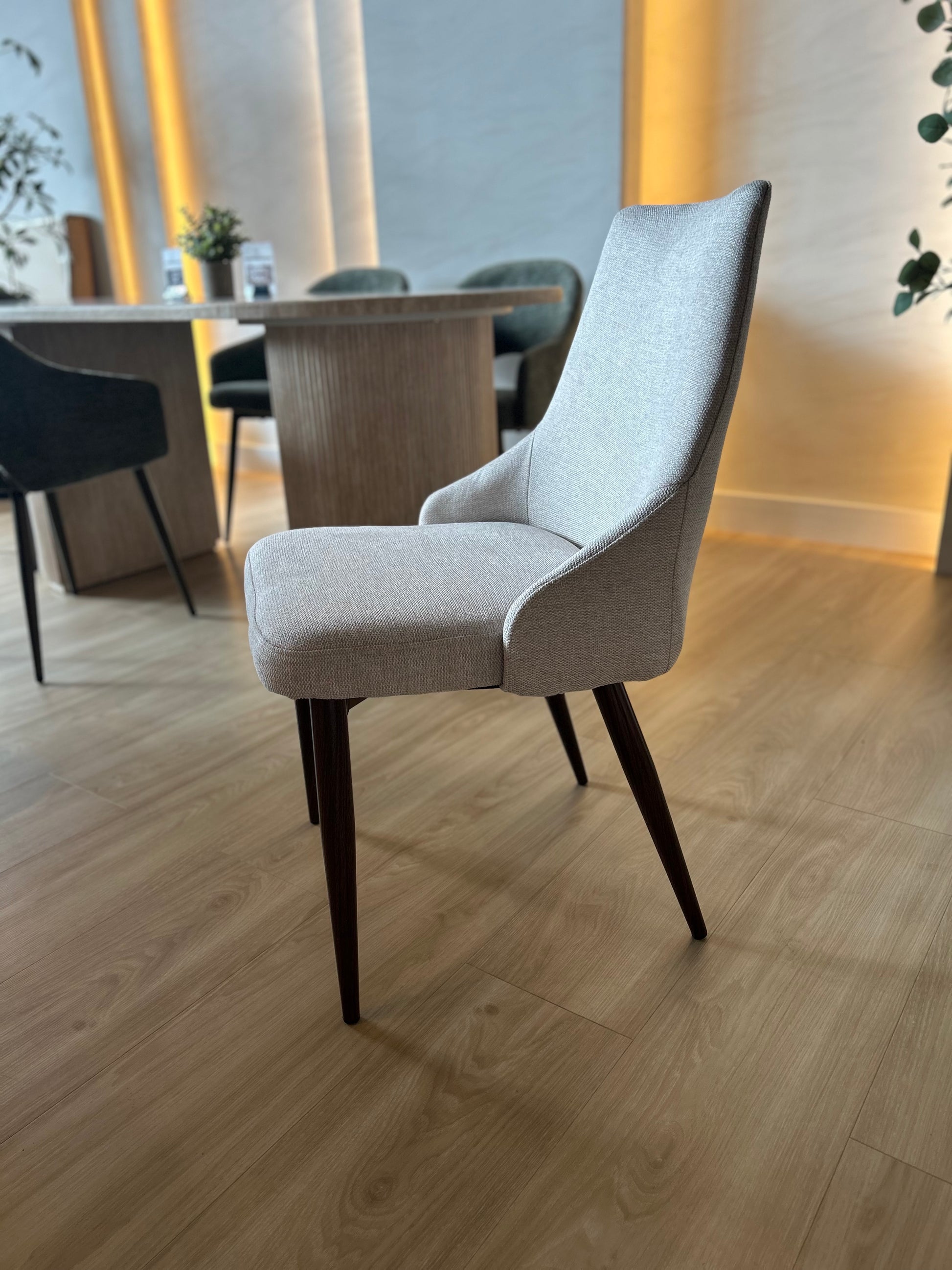 Silla de comedor tapizada en elegante tela beige. Patas de acero color nuez oscuro.