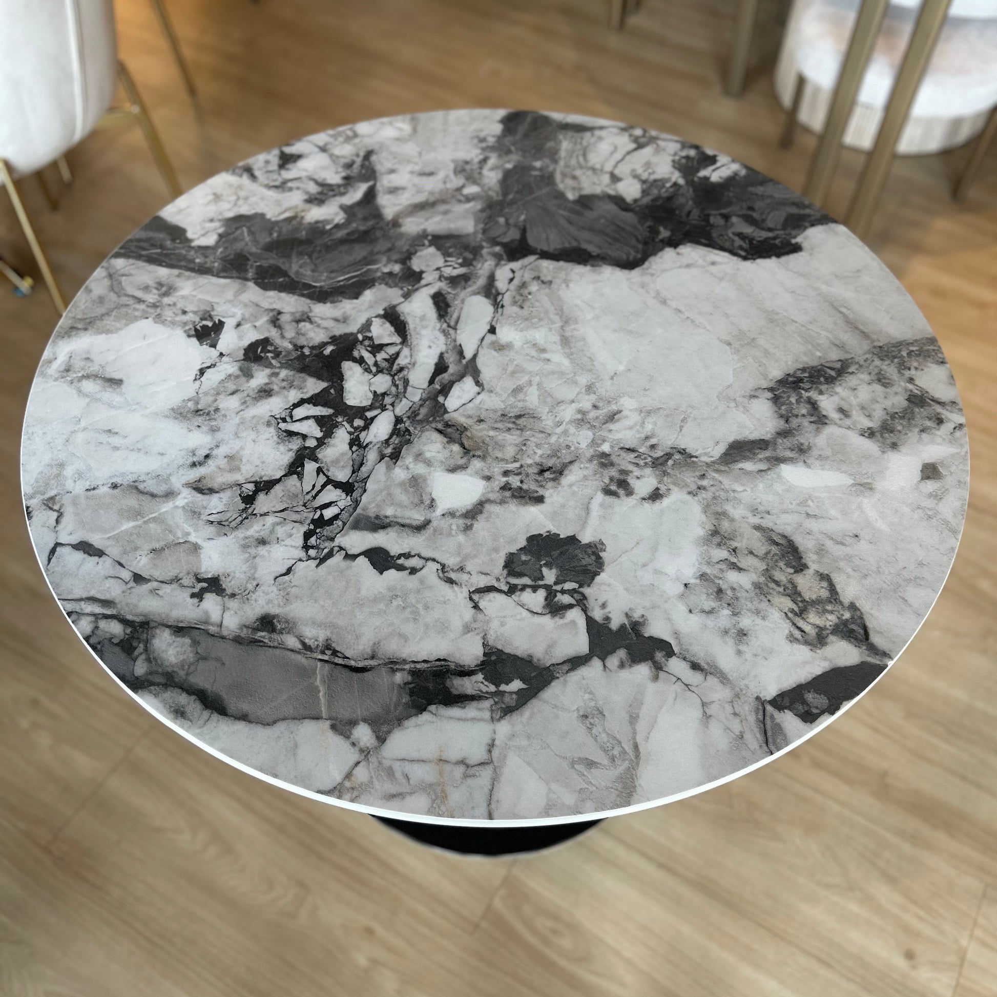 Mesa comedor redonda de 4 puestos. Base de acero negro. Sobre de piedra sinterizada con textura