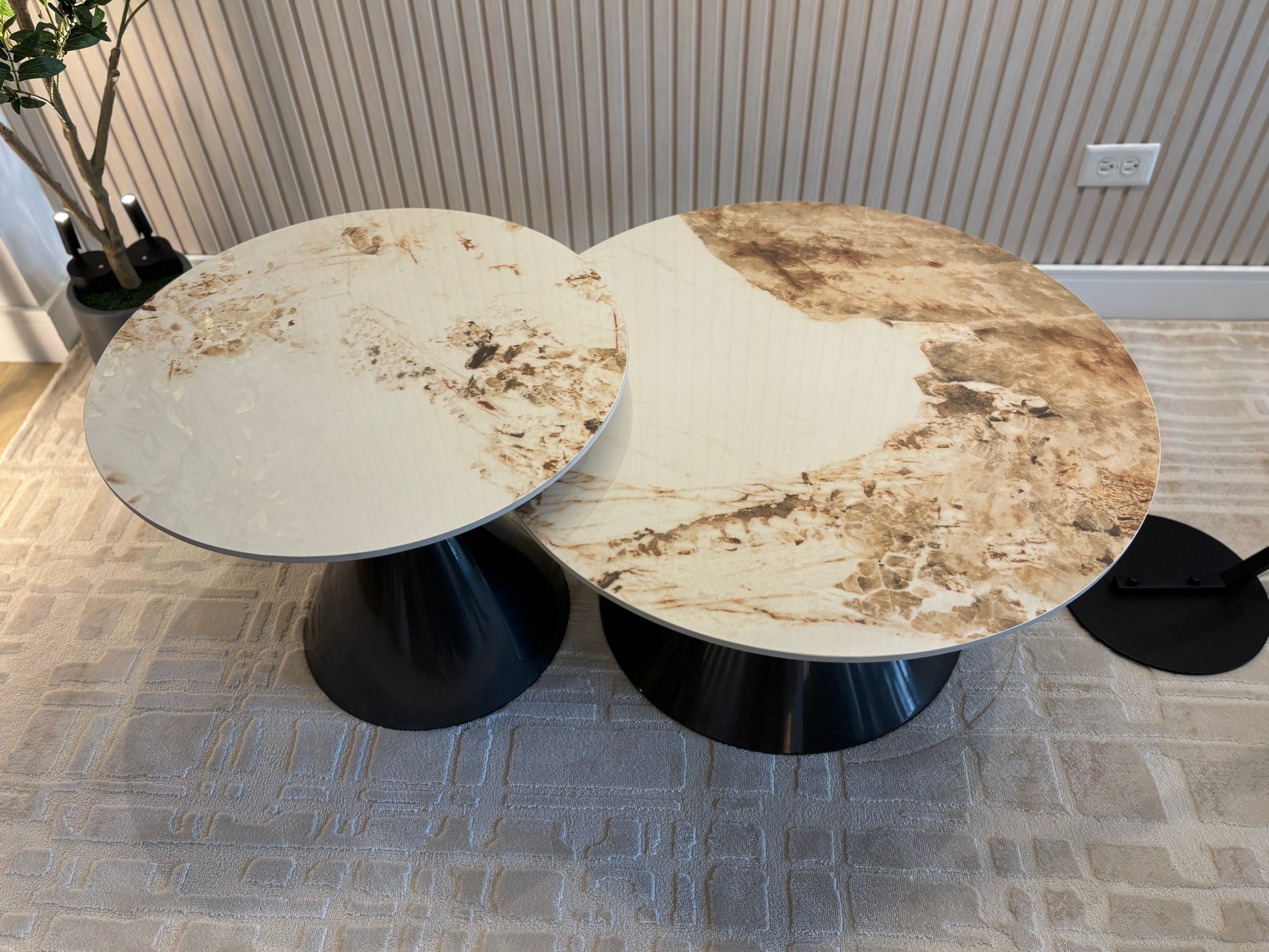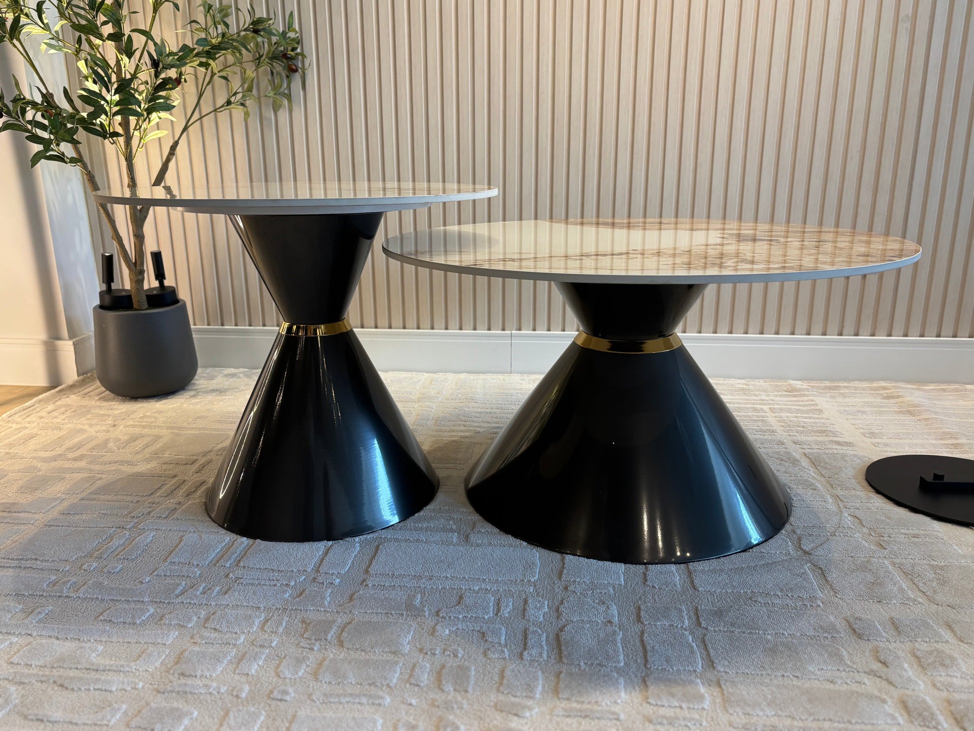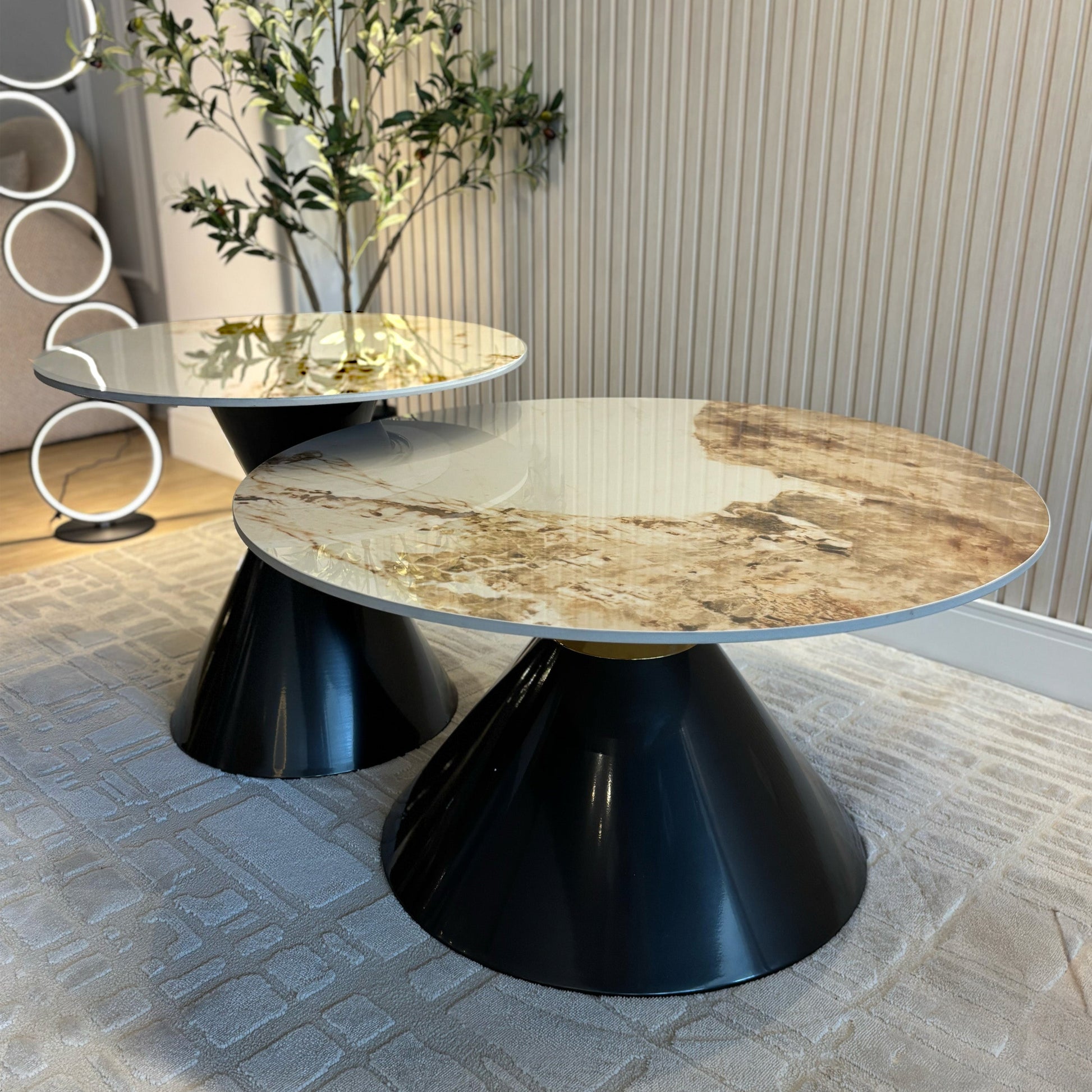 Estiloso set de mesas de centro. Base de acero y sobre de cerámica brillante.