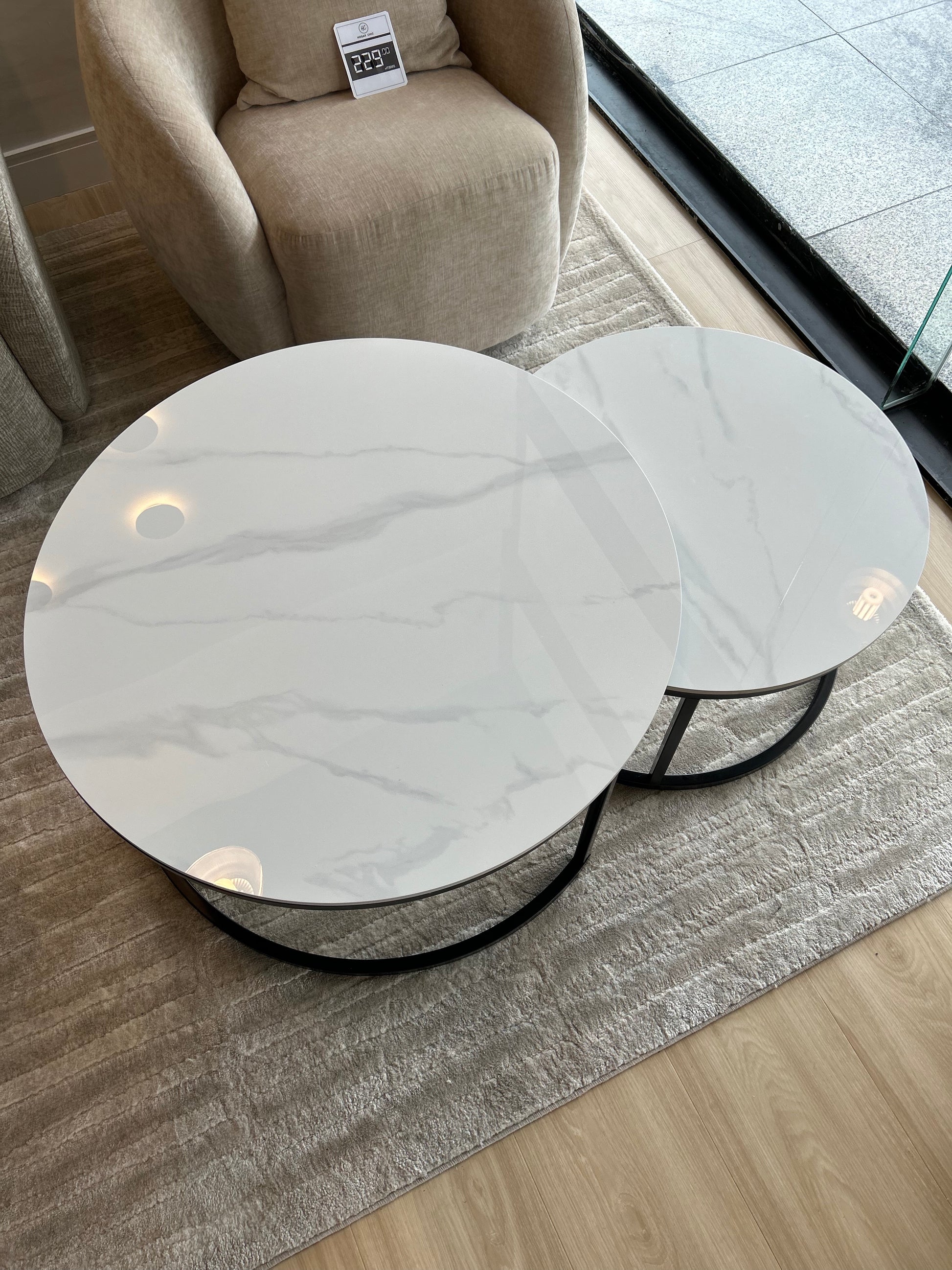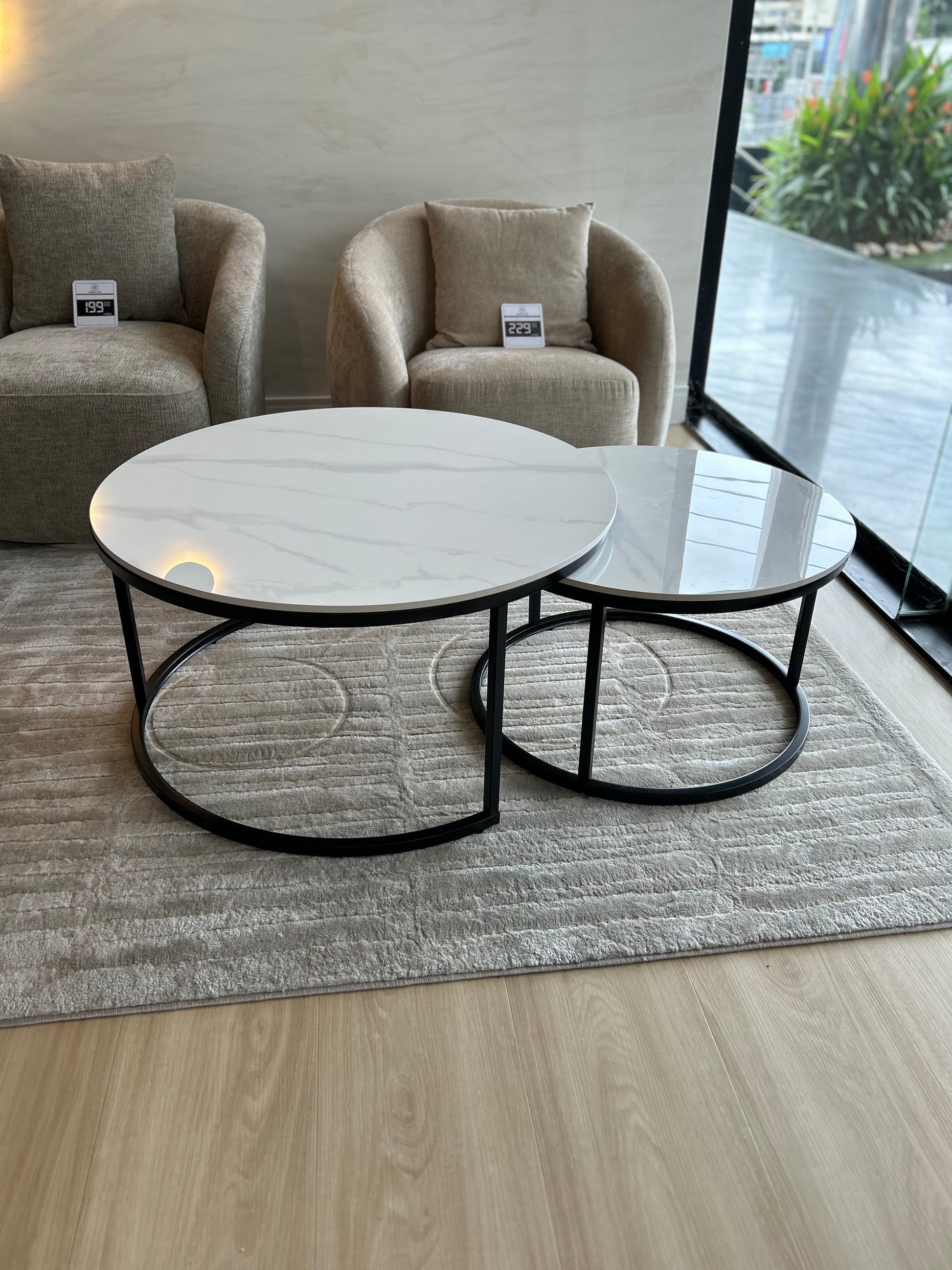 Hermoso juego de 2 mesas de centro. Sobre de piedra sinterizada + base de acero en color negro