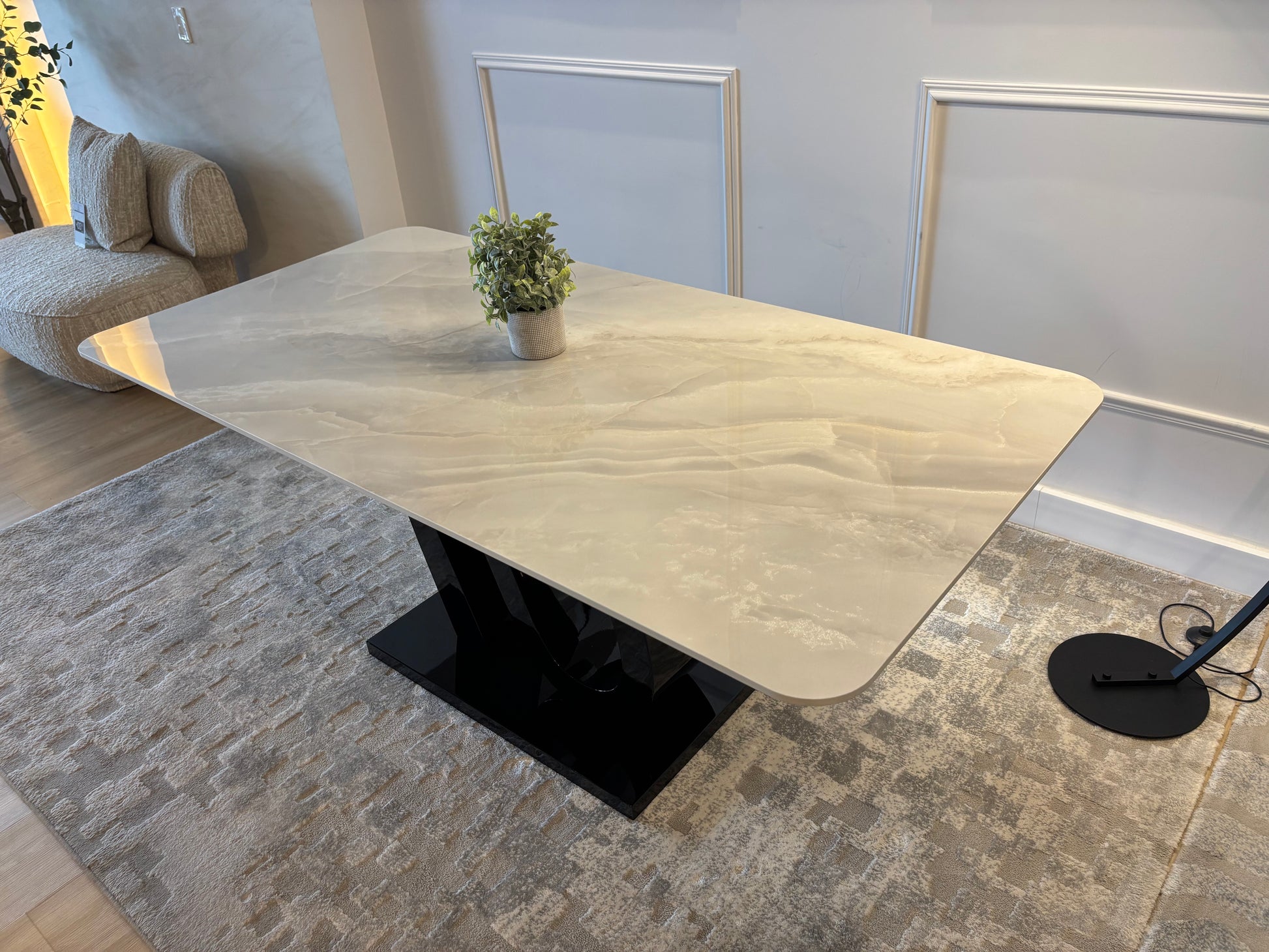 Mesa comedor moderna de 6 puestos. Base de MDF negro y sobre de vidrio templado blanco.