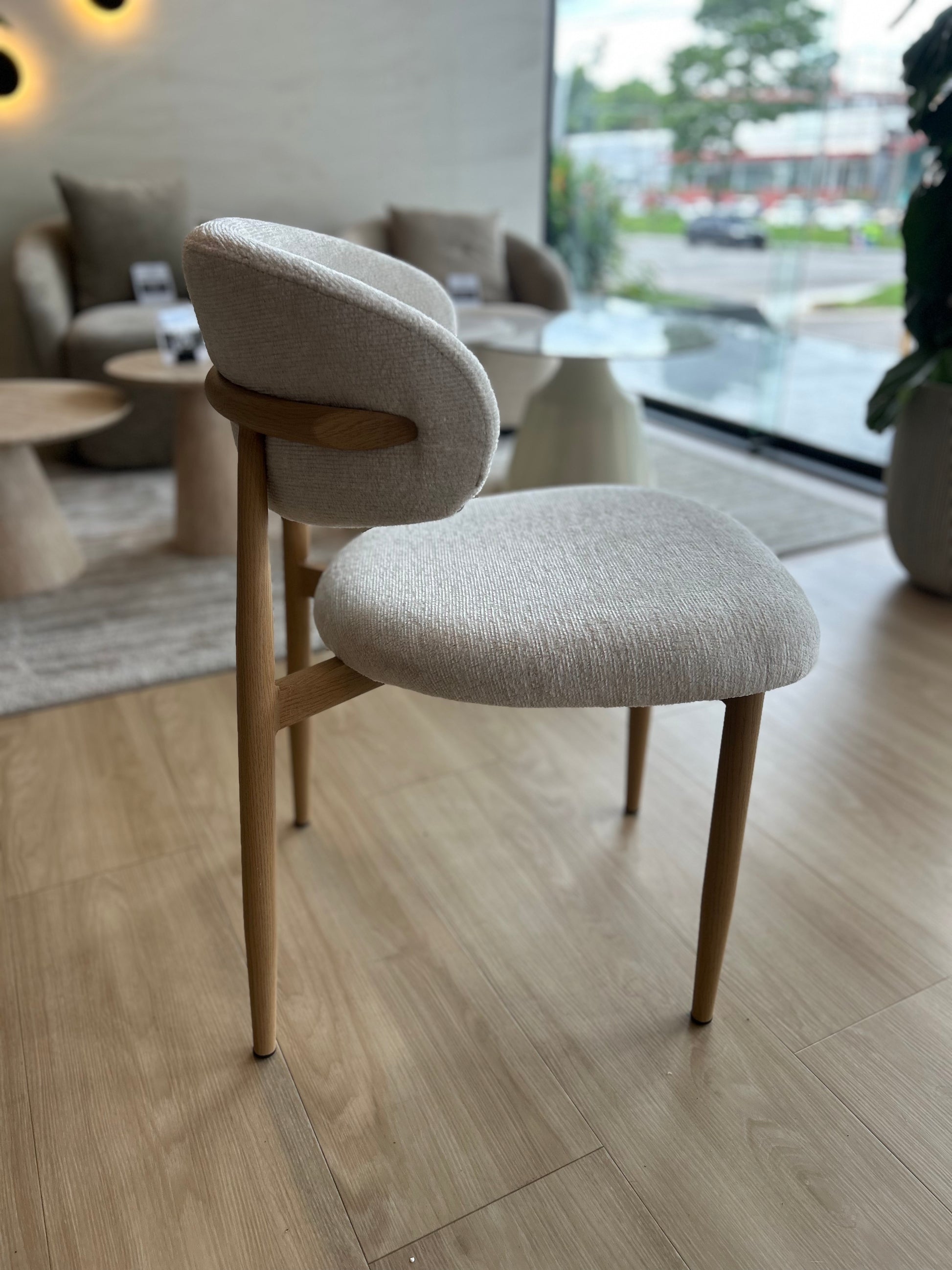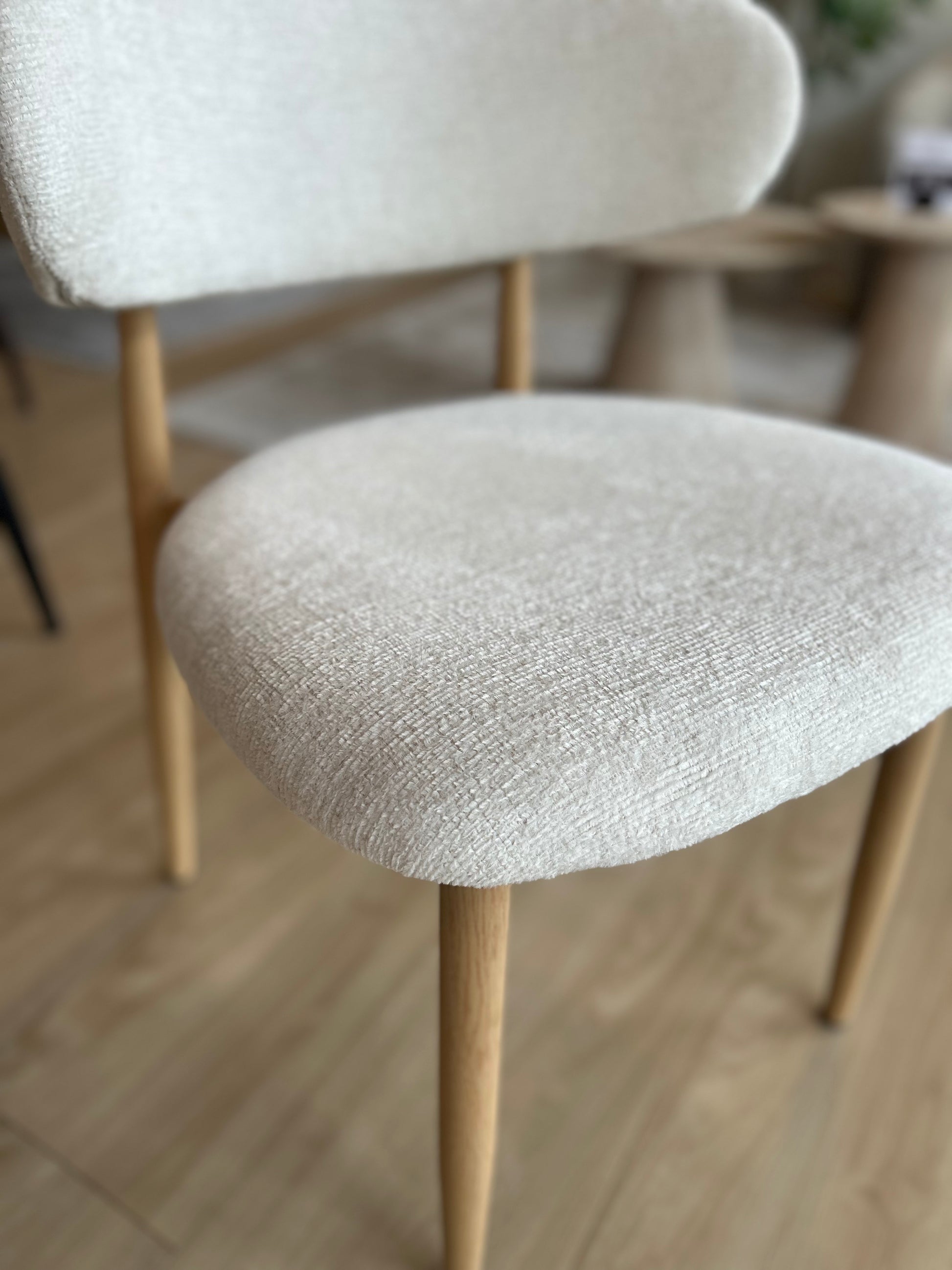 Silla de comedor tapizada en elegante tela blanca. Patas de acero color roble.