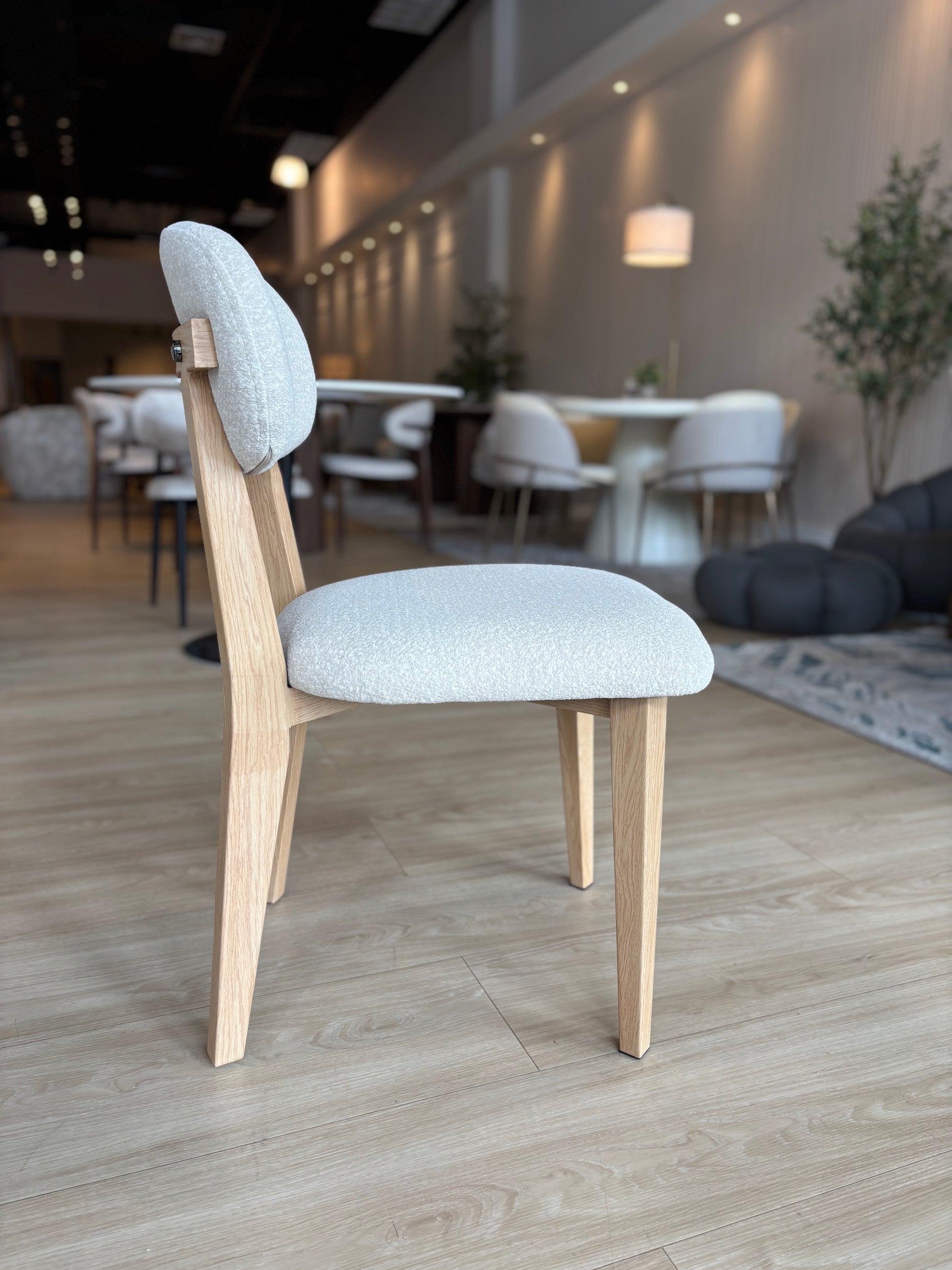 Silla de comedor tapizada en elegante tela crema. Patas de acero color roble.