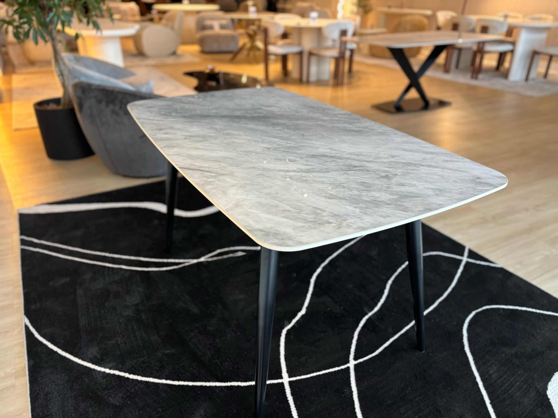 Mesa comedor moderna de 4 puestos. Base de acero y sobre de cerámica brillante.