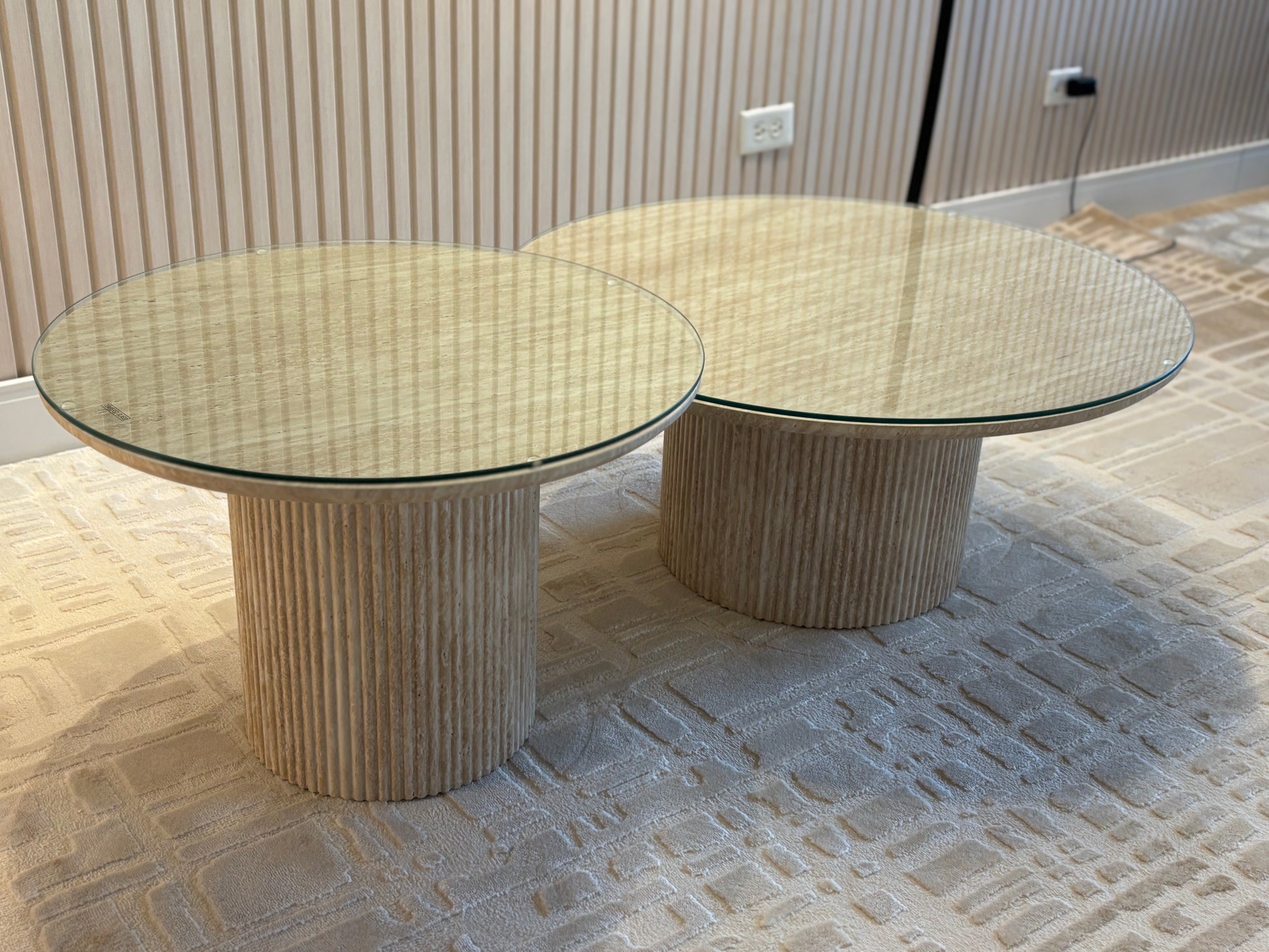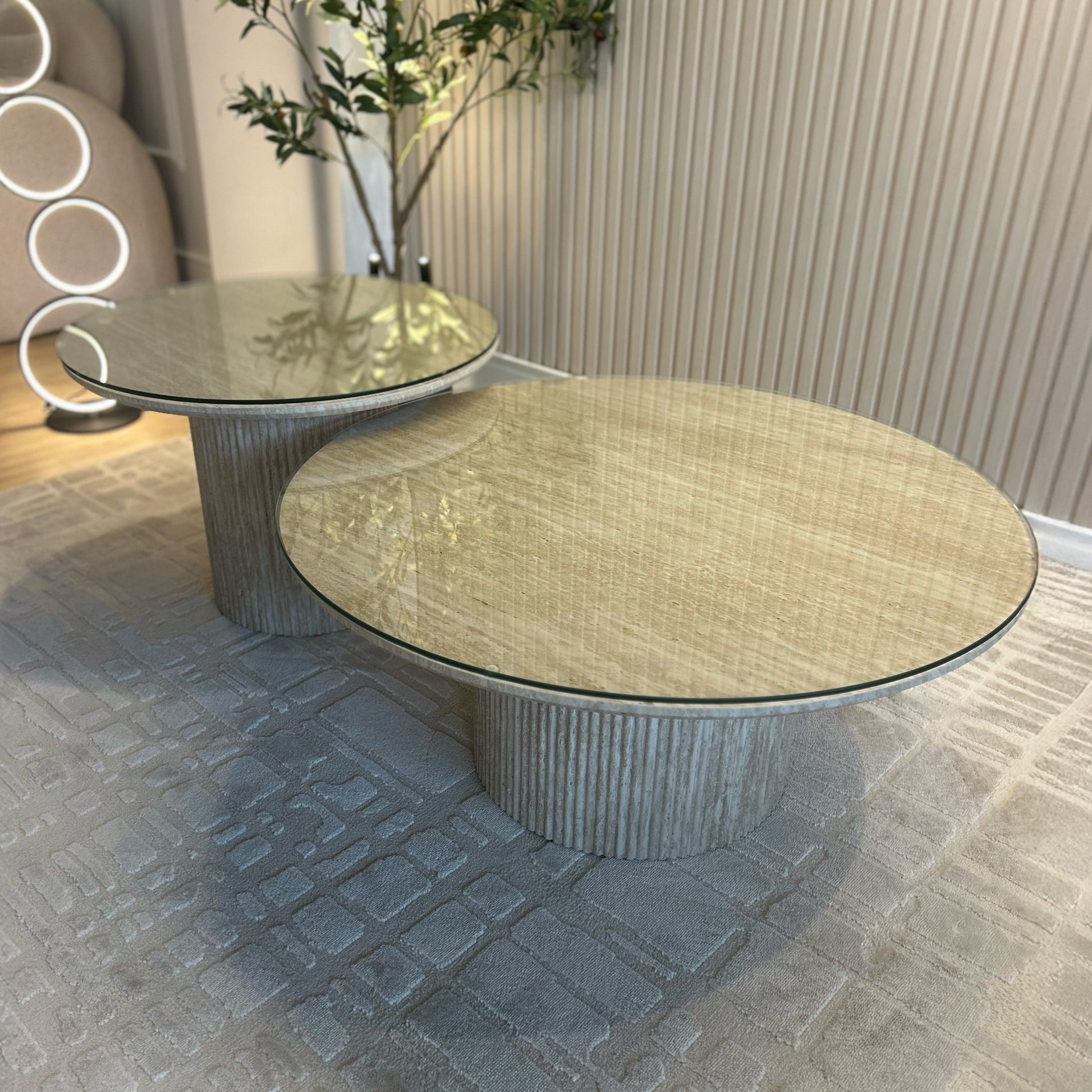 Set de mesas de centro con diseño de travertino. Base de MDF. Sobre de MDF con vidrio transparente.