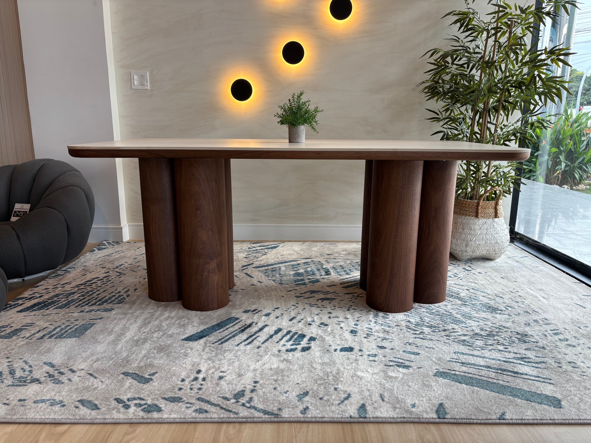 Mesa de comedor para 6 puestos. Base fabricada en MDF recubierto con lámina decorativa color nogal (laminado), que imita la apariencia de la madera natural. Sobre de piedra sinterizada con diseño de piedra travertino