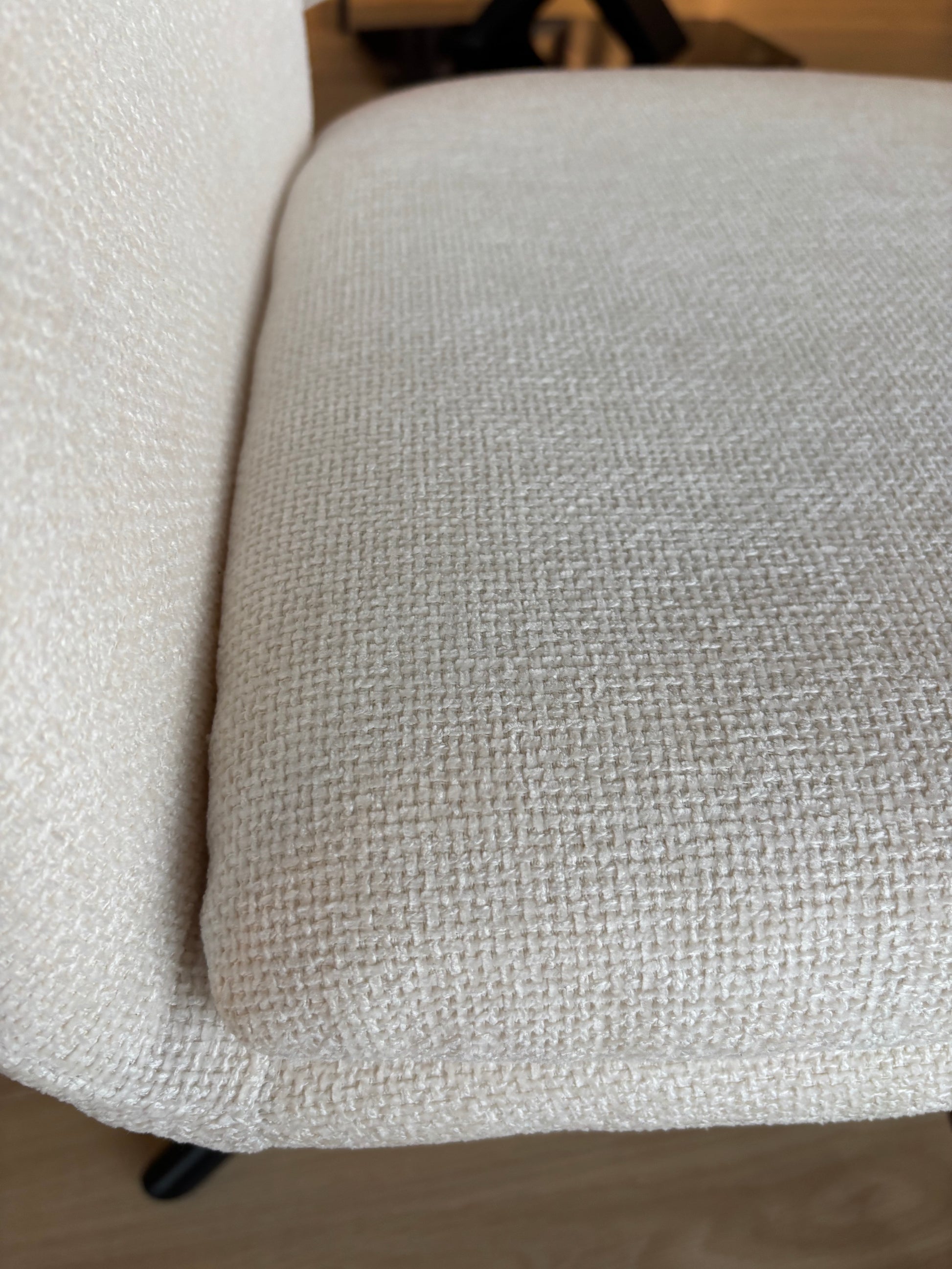 Silla de comedor giratoria, tapizada en tela color beige. Base de acero.
